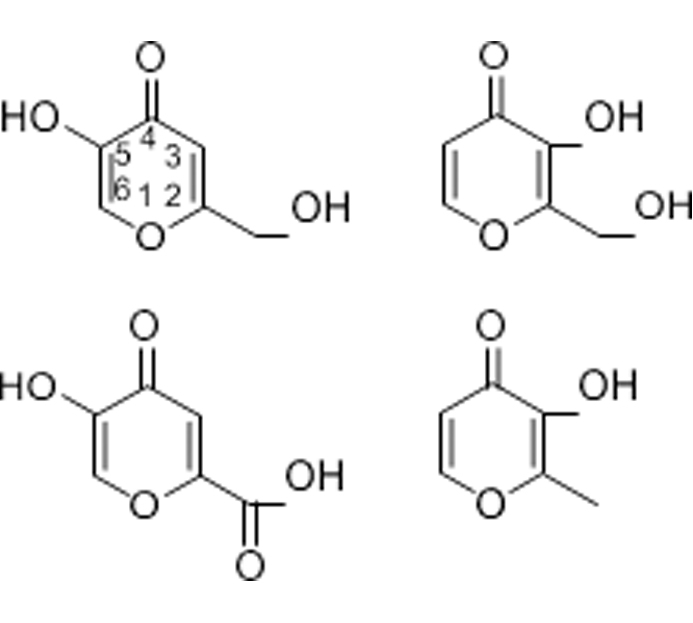 được hình thành trên môi trường 10% glucose; 1/10 glucose được chuyển thành acid kojic. Các quan sát hóa học của Yabuta gợi ý rằng acid kojic có một trong hai cấu trúc hydroxy-c-pyrone 1 hoặc 2, gần giống với acid comenic 3 và maltol 4.