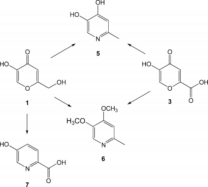 Qua quy trình nhiều bước (Sơ đồ 1) các sản phẩm dẫn chất pyridin 5 (4,5-dihydroxy-2- metylpyridin) và 6 (4,5-dimethoxy-2-methylpyridin) đều thu được từ hai acid này xác nhận thêm về cấu trúc được chấp nhận hiện nay, 5-hydroxy-2-(hydroxymetyl)-4H-pyran-4-on (5-hydroxy-2- hydroxymetyl-cpyrone) 1, còn chuyển hóa thành 5-hydroxypicolinic acid 7. Ngoài ra, cấu trúc acid kojic đã được xác định bằng phương pháp nhiễu xạ tia X. Acid kojic và một số các dẫn xuất đã được tổng hợp hóa học từ glucose và các carbohydrat khác.