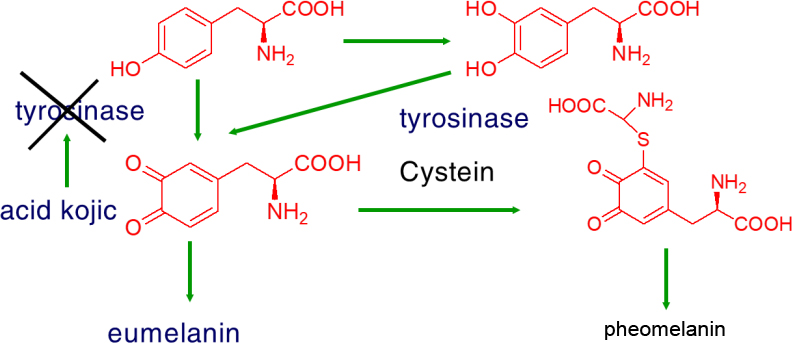 acid kojic cũng ức chế quá trình hình thành hắc tố được quy cho sự kết hợp của hai hiệu ứng: (i) sự ức chế tác động lên quá trình oxy hóa polyphenoloxidase (PPO) của L-tyrosin và (ii) loại bỏ của o-quinone bằng cách kết hợp với acid kojic, do đó ngăn ngừa trùng hợp thành melanin.